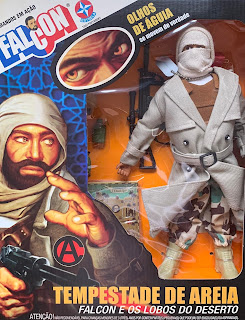 "Falcon e Os Lobos do Deserto - Tempestade de Areia"... O extenso nome da mais recente aventura do "Falcon" já impõe respeito, tanto quanto o fato desta peça vir armada até os dentes: Com uma metralhadora INÉDITA na coleção (nunca antes lançada nem mesmo em separado) E uma pistola Luger (essa já é velha "parceira" de guerra do boneco, mas que agora vem em um belo coldre de tecido - que parece uma camurça). Acompanha ainda: Um baú de tesouro, um mapa, um cantil, uma marmita com talheres, botas EXCLUSIVAS feitas pra esta aventura, uma DOGTAG pra identificação (o Falcon é 1º sargento), um sobretudo (pra proteger o herói das noites frias no deserto e das tempestades de areia: que dão nome à aventura), um colete de camurça (ou tecido similar), e um turbante. Além da figura ter "olhos de águia" ainda por cima e um tom de pele diferenciado e único em toda a coleção!